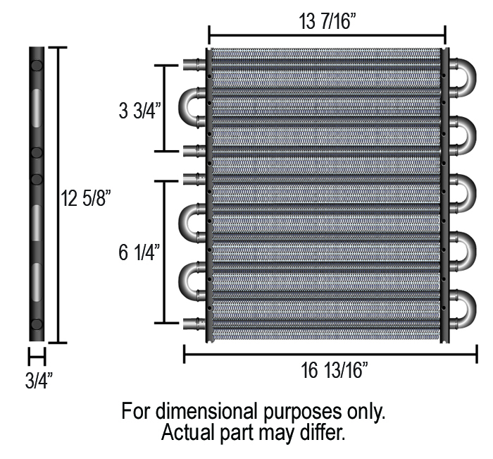 Featuring a free-flowing 4 & 6 pass cooler in one compact package and fabricated of 1/2″ copper tubing and aluminum cooling fins, this Made-in-the-USA Dual-circuit cooler includes 2 each 11/32″ and 2 each 1/2″ barb inlets. It provides heat transfer capabilities for two independent systems such as engine and transmission or transmission and power steering that competitive units just can’t match at anywhere near the price.